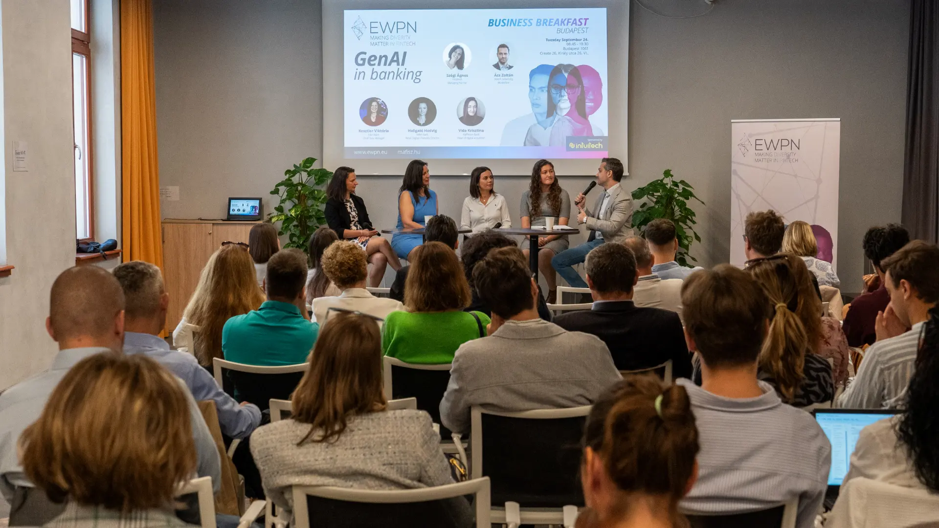 Címlapfotón (balról jobbra): Hallgató Hedvig (MBH), Kesztler Viktória (K&H), Szögi Ágnes (EWPN), Vida Krisztina (Raiffeisen), Ács Zoltán (MAFISZ) 2024. szeptember 23-án az EWPN Business Breakfast | Kép forrása: EWPN (készítette: Aida Kavalecz)