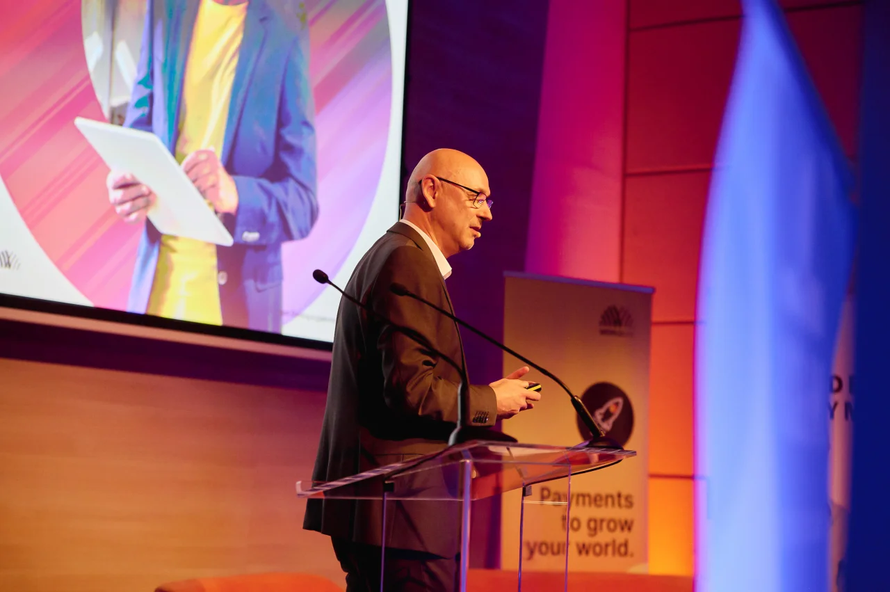 Fotón: Püspök Ernest, a Worldline Financial Services közép-kelet-európai régióért felelős üzletfejlesztési igazgatója 2024. április 16-án a PayTechShow-n (forrás: FinTech Group, készítette: Kovács Dávid)