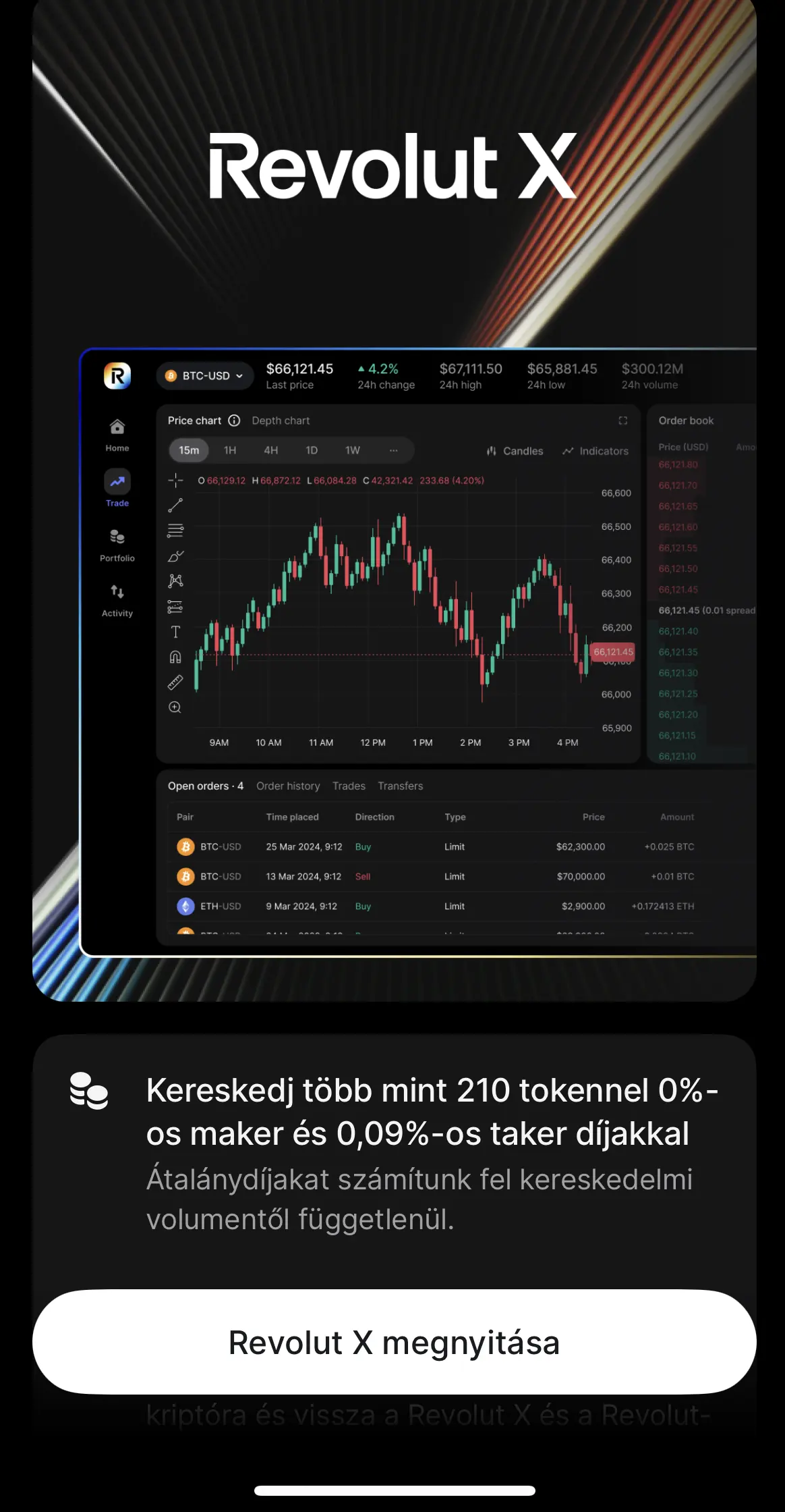 Bár az átjárhatóság a Revolut applikációból biztosított a Revolut X platformra, egy külön alkalmazás áll mögötte, amely kifejezetten a professzionális kereskedők igényeire lett szabva. Több eszközt kínál, alacsonyabb díjakkal, és ami a legfontosabb, lehetővé teszi a megvásárolt kriptovaluták közvetlen kiutalását egy saját tárcába.