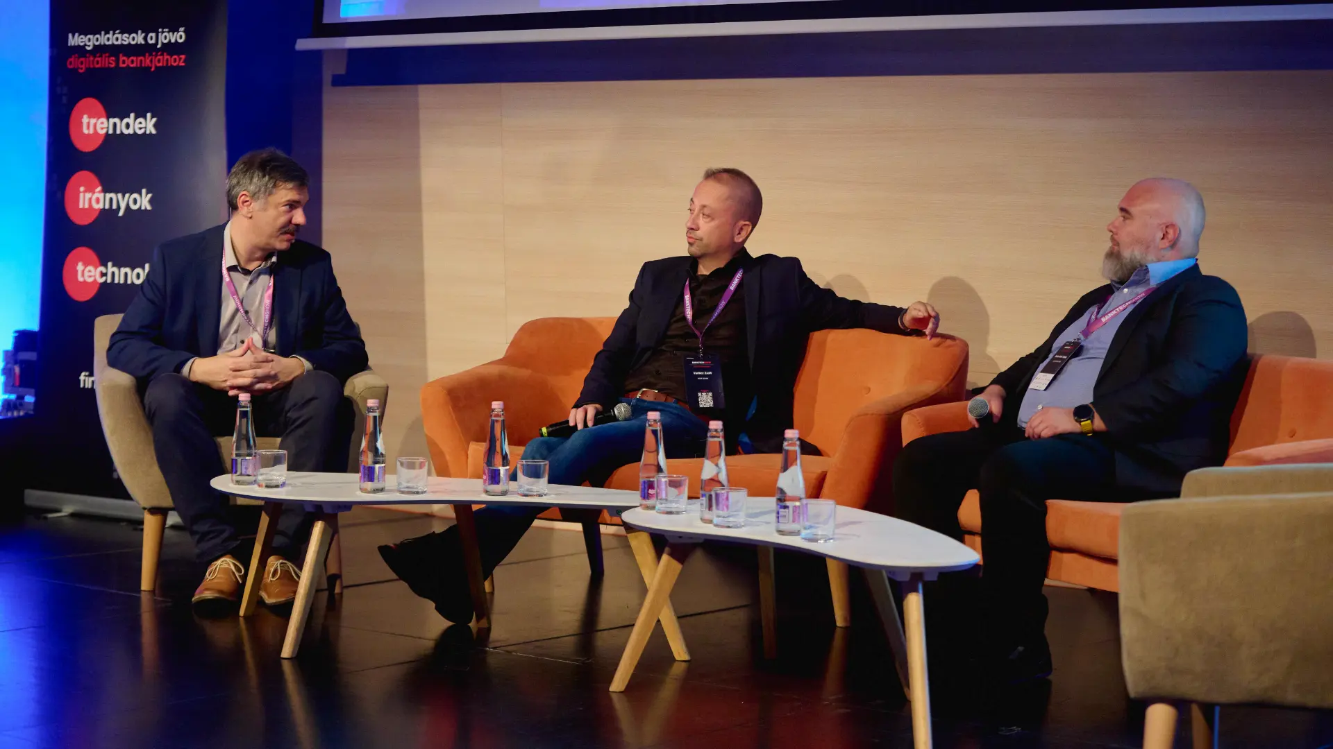 Címlapfotón (balról jobbra): Kiss Gergely (Attrecto Zrt.), Vadócz Zsolt (K&H Bank), Farkas Márk Tamás (Raiffeisen Bank) a BankTechShow-n | Kép forrása: FinTech Group (készítette: Kovács Dávid)