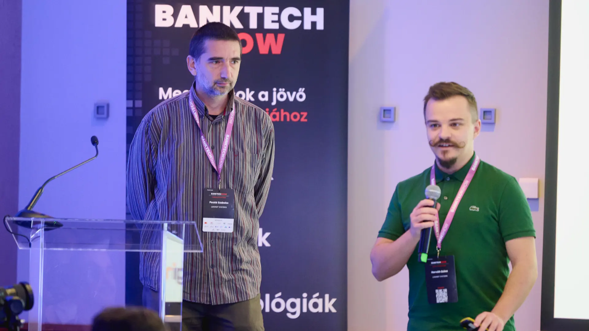 Címlapfotón (balról jobbra): Fosztó Szabolcs senior PHP fejlesztő (LogiNet Systems) és Horváth Bálint solution architect (LogiNet Systems) a BankTechShow-n | Kép forrása: FinTech Group (készítette: Kovács Dávid)
