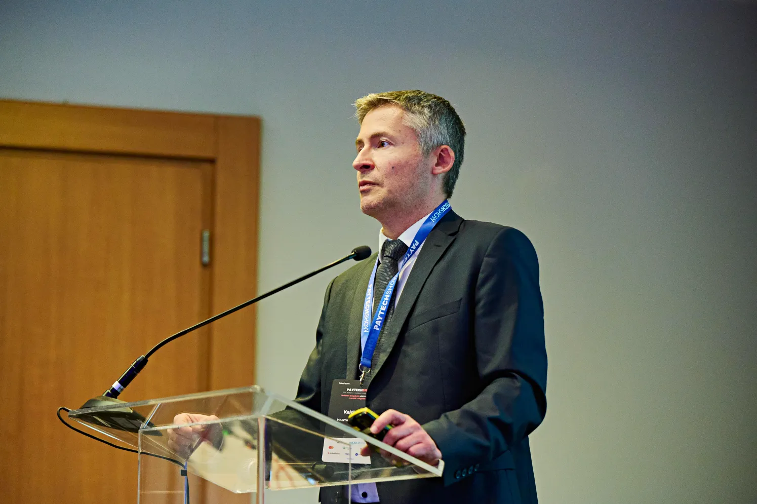 Fotón: Kajdi László, a Magyar Nemzeti Bank pénzügyi infrastruktúra és pénzforgalom fejlesztési osztályának vezetője 2025. április 15-én a PayTechShow-n. Forrás: FinTech Group Kft. (Készítette: Kovács Dávid)