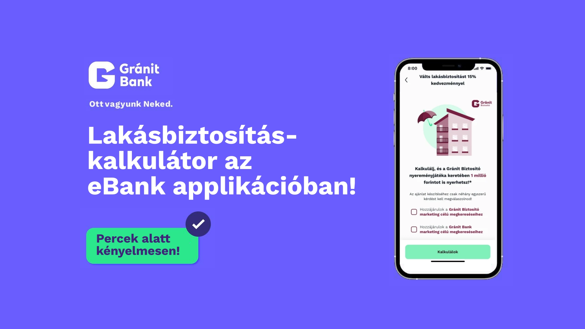 A Gránit Bank a hazai szektorban vezető szerepet vállalt azzal, hogy eBank applikációjába elsők között integrált lakásbiztosítás-kalkulátorral percek alatt lehetőséget teremt kedvezményes lakásbiztosítási ajánlatok kalkulálására.